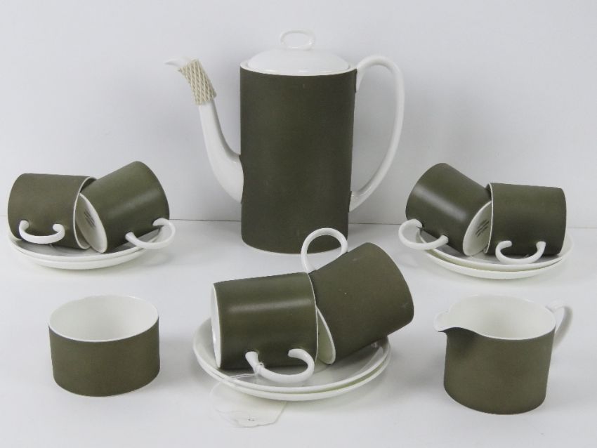 A Susie Cooper coffee service in 'Forest' c2094 pattern including six coffee cans and saucers, coffee pot, milk and sugar.