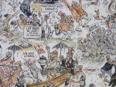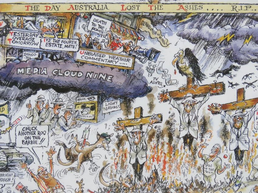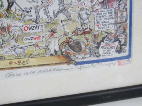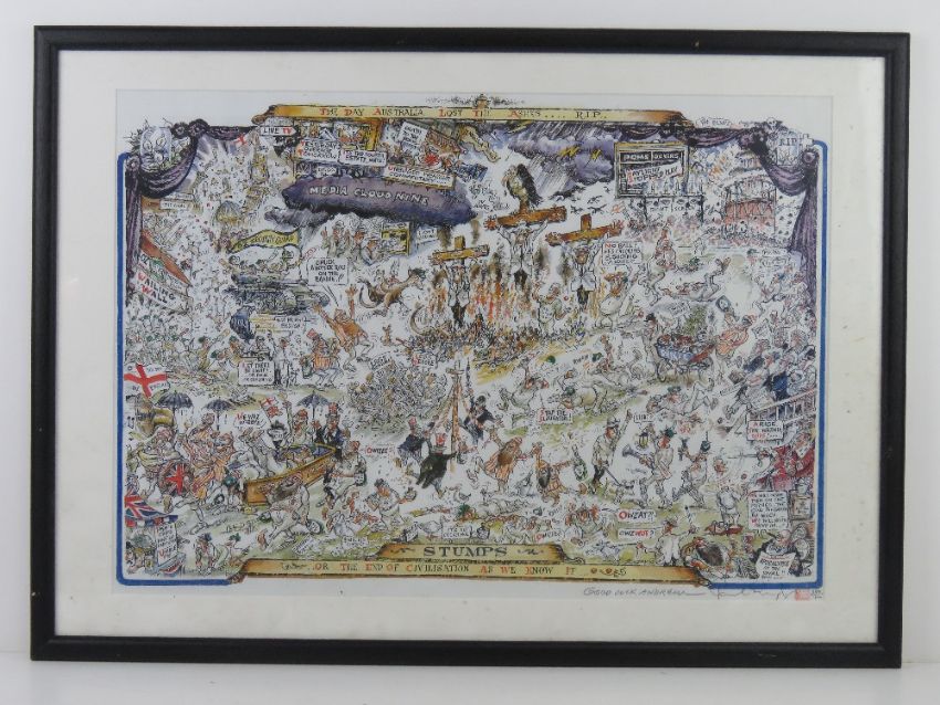 Limited edition signed print 'The Day Australia Lost The Ashes RIP or The End of Civilisation As We Know It', signed in pencil 'Good Luck Andrew' by the artist Paul Rigby, no.359/1000, 59 x 42cm, framed and mounted.