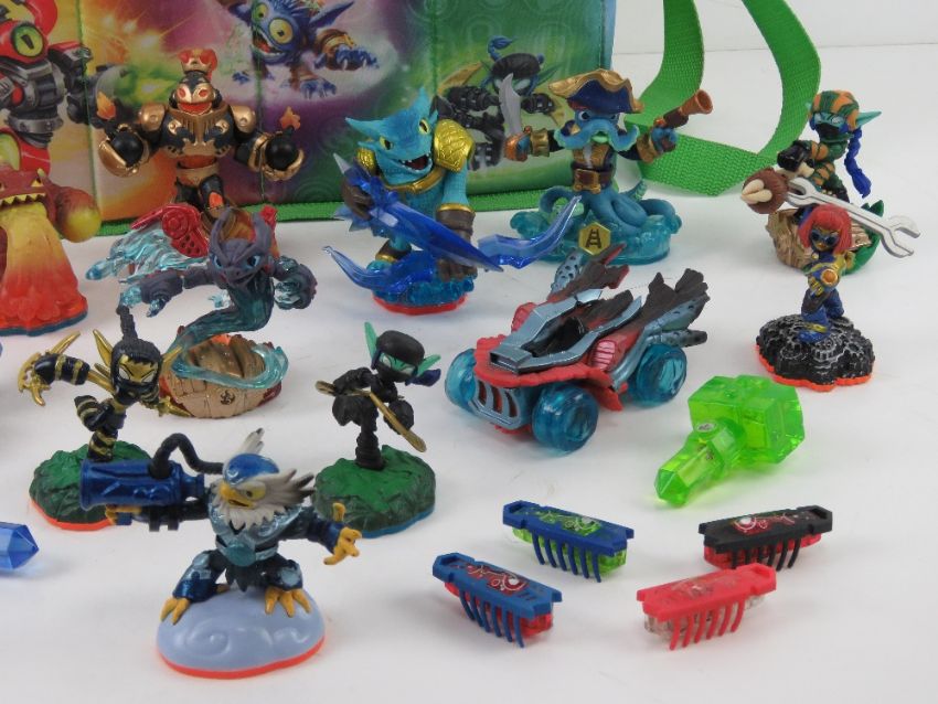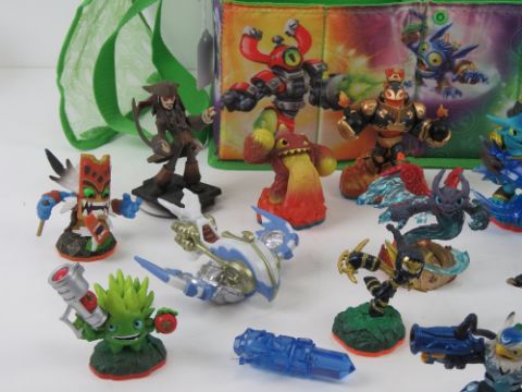 A quantity of assorted Skylander models by Activision contained within Skylander carry case. Also a Disney Infinity figure of Captain Jack Sparrow.