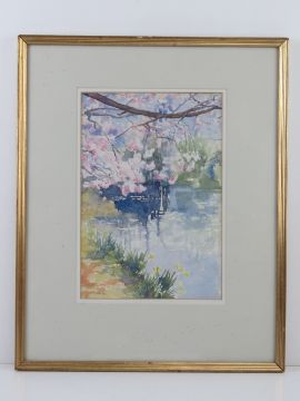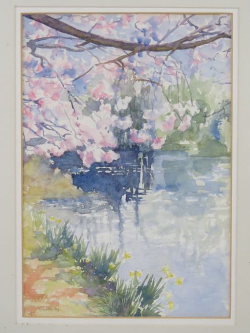 Watercolour by Guy Gravett entitled 'Glyndebourne in spring blossom and daffodils', 32 x 22cm framed and mounted.