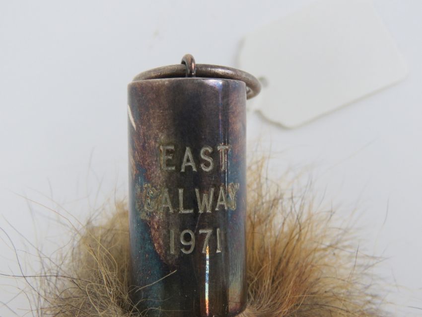 A fox brush bearing nickel plated brush stop with hanging loop marked East Galway 1971.