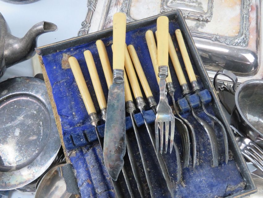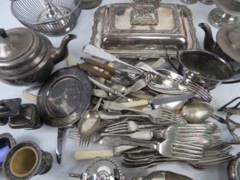 A quantity of silver plated items including; lidded tureen, candelabras, toast rack, coffee pot, teapots, cutlery including large serving spoon, cruet set, etc.