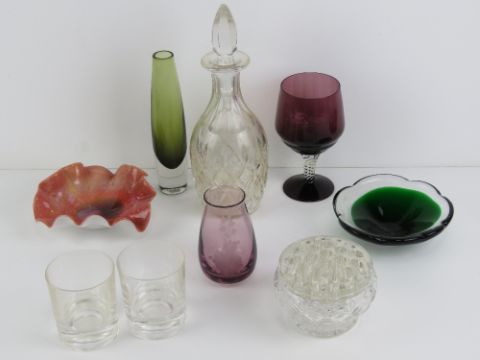 A cut glass decanter with stopper together with an overlaid glass frilled dish, four pieces of coloured art glass, a pair of tumblers having City of Durham crest etched upon and a lead crystal bowl with flower stem separator. Nine items.
