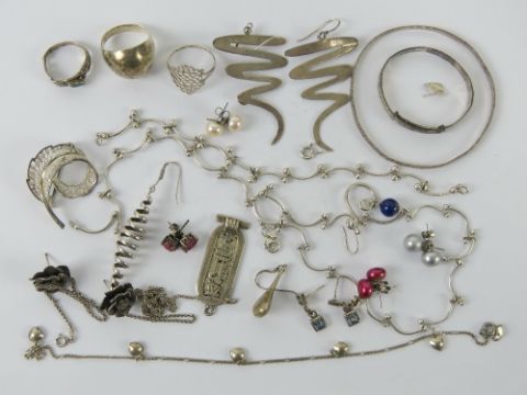 A quantity of assorted silver and white metal jewellery inc earrings, rings, Christening bangle, filigree brooch etc.