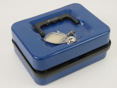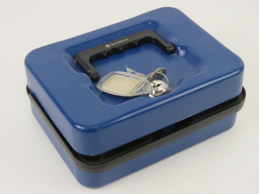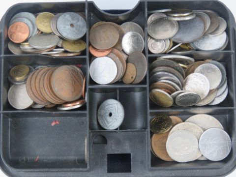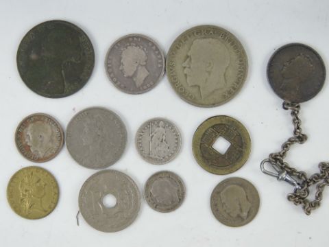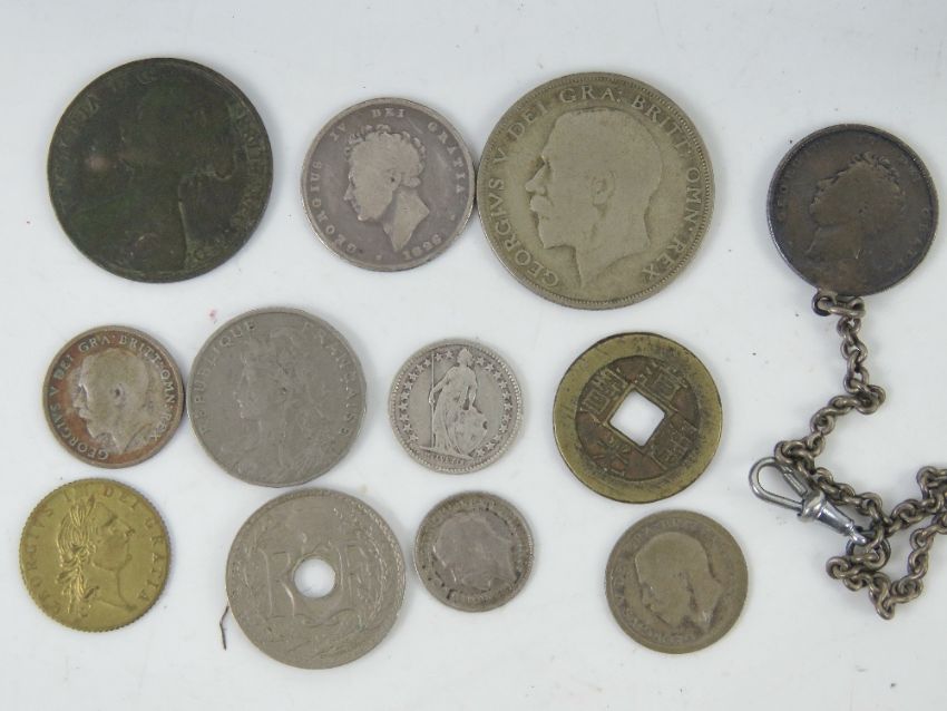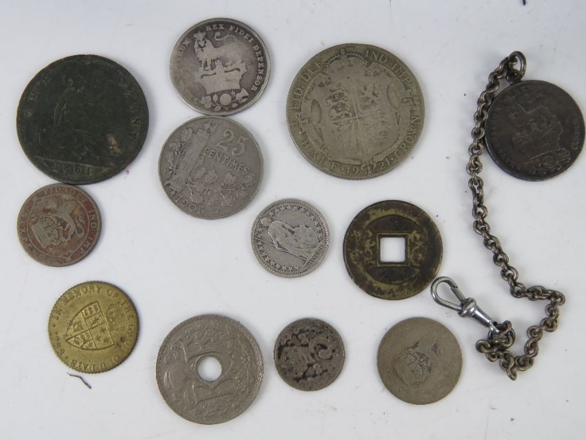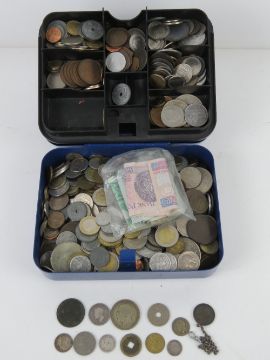 A quantity of assorted world coinage and bank notes, some silver noted including George IV 1826 and 1921 half crown, also 1905 and 1927 25 centimes French republic coins, 1/2Fr 1916, 1861 'young head' Victoria penny, a token in the form of a "spade guinea", etc. All contained within a metal 'petty cash' box with key.