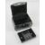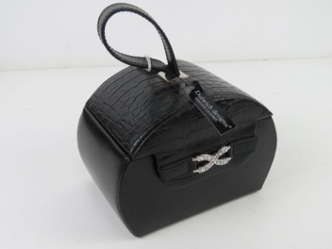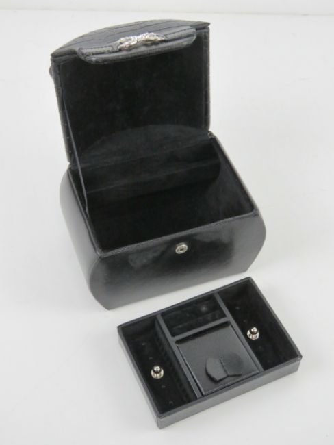 A contemporary black leather jewellery case having various compartments within. 15 x 10.5 x 21cm.