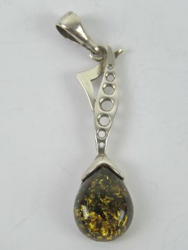 A large silver and green Baltic amber pendant, abstract geometric design with teardrop shaped amber cabachon, stamped 925, total length 5.1cm.