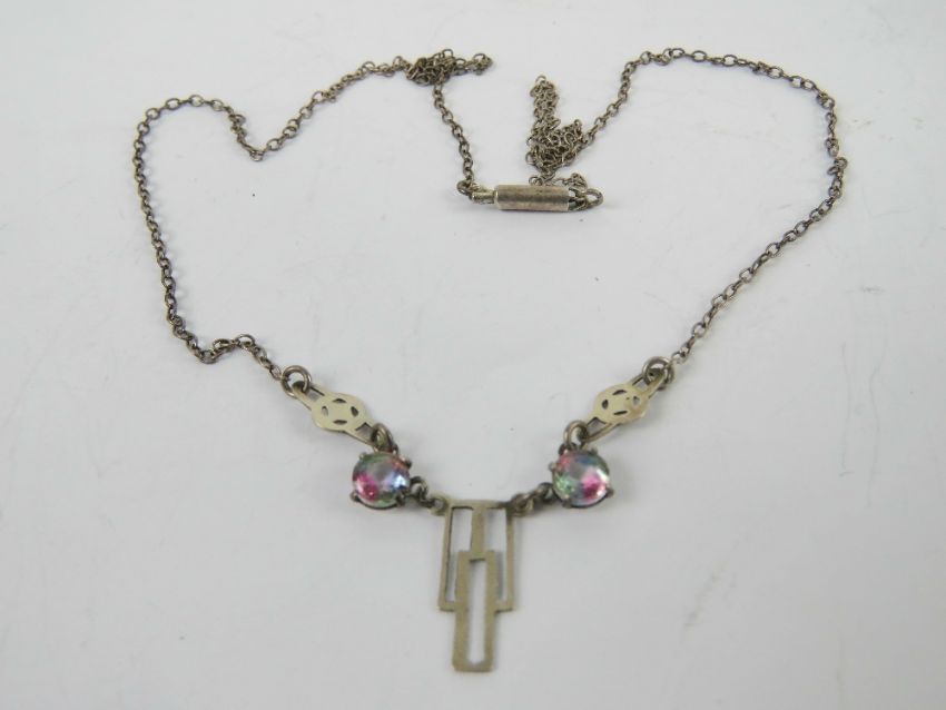 An Art Deco necklace having central geometric panel flanked by multi-colour paste stones, no apparent hallmarks.