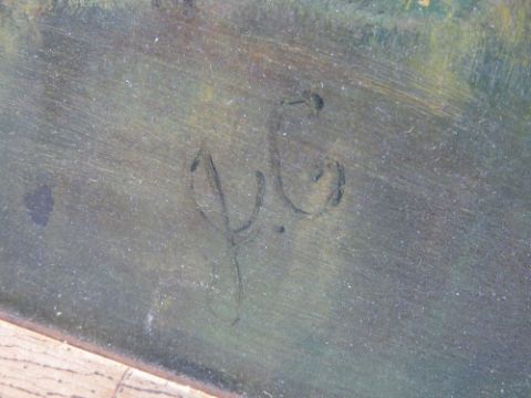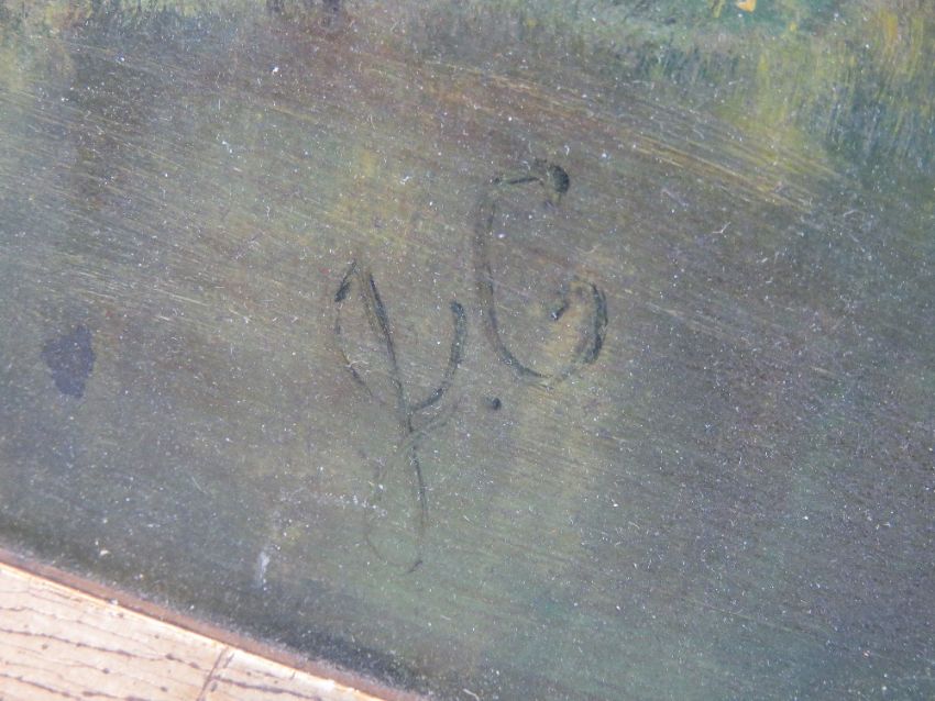 Oil on board, naive study of a riverside, house and trees beyond, monogrammed lower left 'JC', 26cm x 45cm.