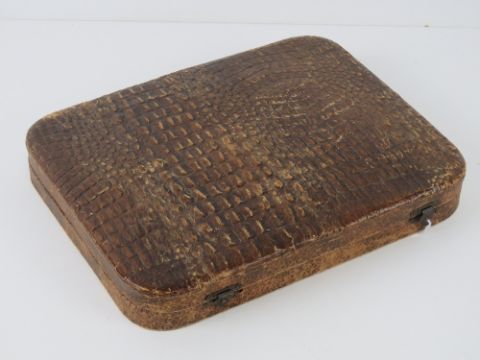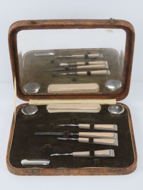 An Art Deco manicure set in 'crocodile skin' fitted box.