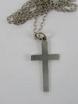 A silver crucifix pendant of plain design, stamped silver, upon white meal chain, 3.2cm in length inc bale.