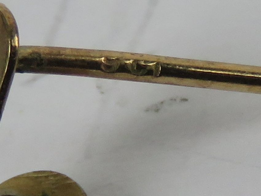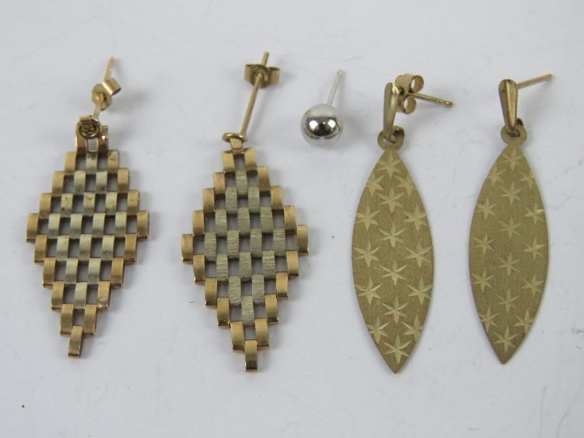 A pair of 9ct gold stud earrings having marquise shaped drops with engraved star pattern upon, stamped 9ct to post, 3.6cm in length. Together with a single 9ct white gold stud earring. Total weight 1.1g. Together with a pair of yellow and white metal earrings, no apparent hallmarks, 1.9g.