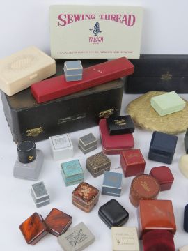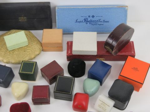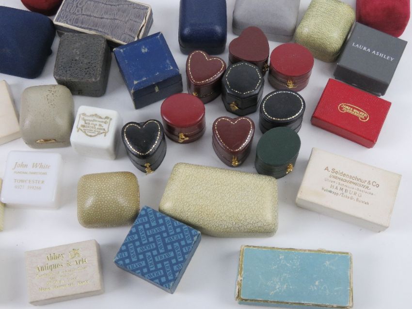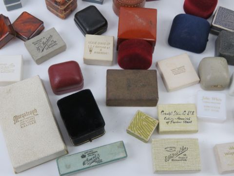 A large quantity of assorted vintage and contemporary jewellery and other boxes inc ring boxes, watch boxes, leatherette stud box, Pompadore pearls clam shell box, antique leatherette bangle box, etc. Approx 86 items in total.