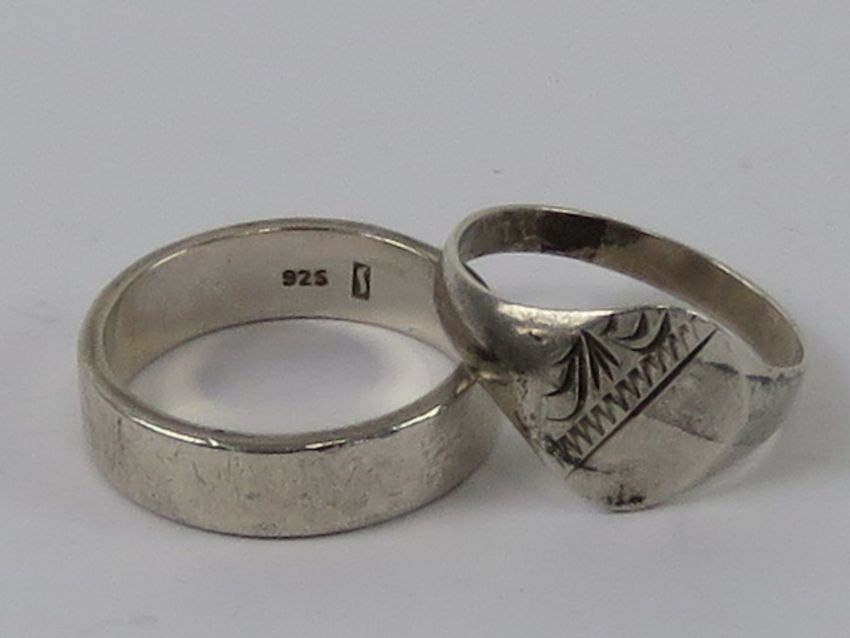 A 925 silver signet ring having half floral engraving, size J. Together with a 925 silver band of plain form size L. Two items.