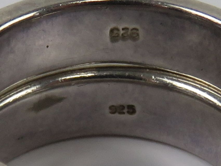 A pair of rings each stamped 925, one with lime green stone, the other with purple stone, each size P-Q.