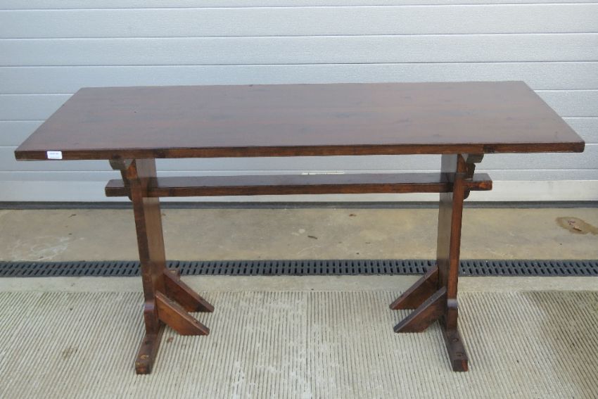 A 20th century stained pine kitchen trestle type table, 5ft x 2ft, 75cm high.