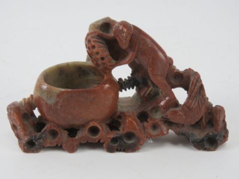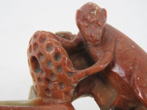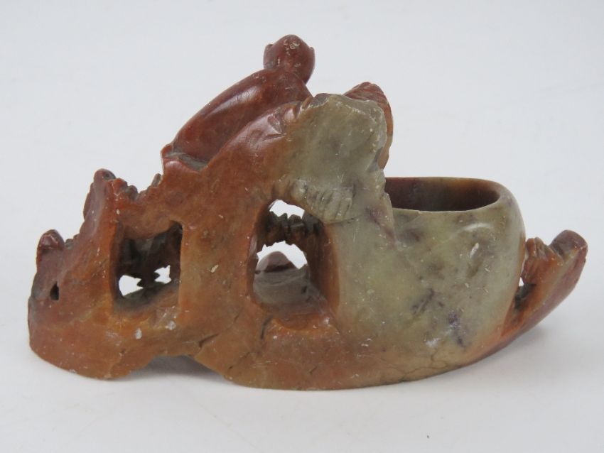 A Chinese soap stone brush pot, carved and pierced and bearing monkey figuring upon, 14cm wide.