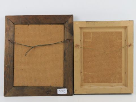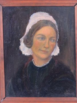 Two oil on board paintings of possibly same female in black dress and white head covering, each in frame, 24 x 19cm and 22.5 x 17cm.
