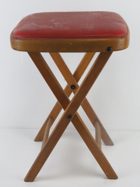 A vintage 1960's beech folding stool with red leatherette seat, 50cm high.