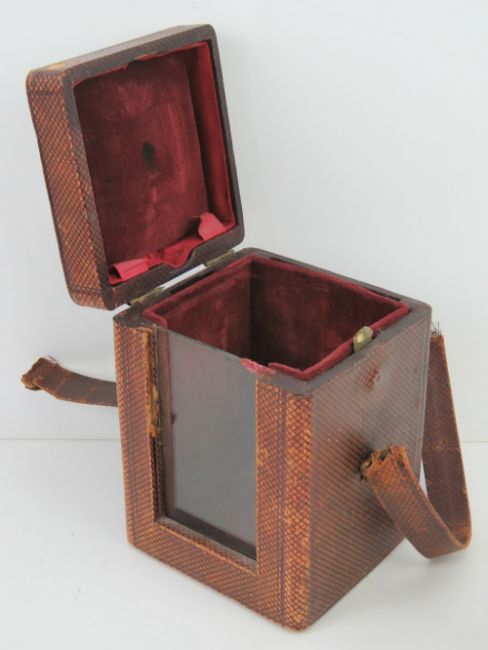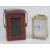 A vintage leatherette travel clock case having velvet lining, strap a/f. Together with a brass Weiss battery carriage clock. Two items.