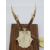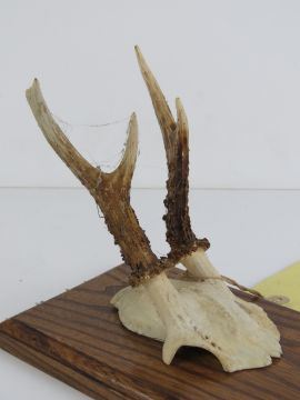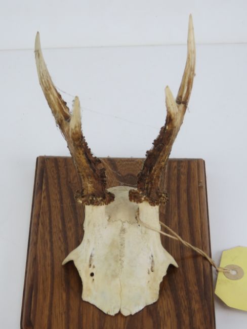 A shield mounted Muntjac deer skull fragment with twin horns bearing label for HM Stockdale Hill Farm Mears Ashby.