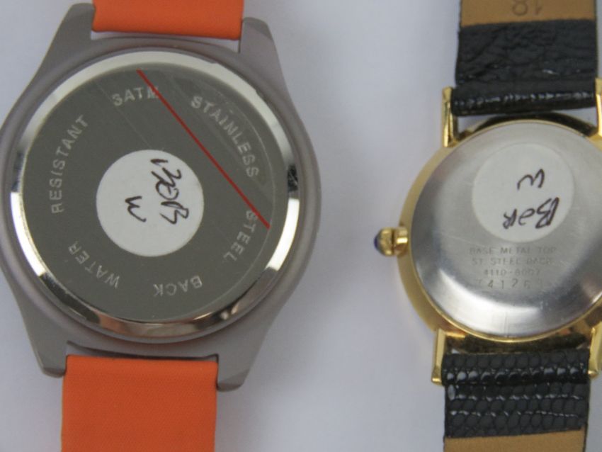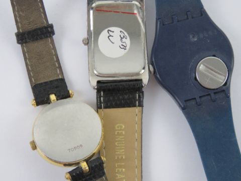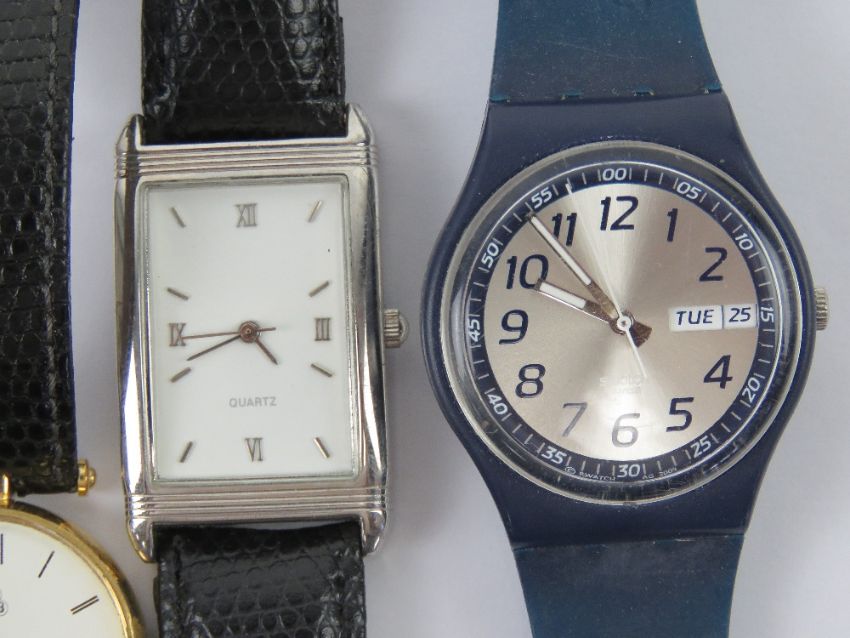 Five assorted watches inc navy blue Swatch, HKB on leather strap, Seiko 4110 8019T on genuine lizard strap and two others.