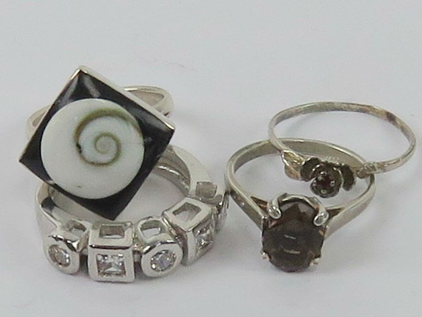 Four silver rings size K-L, including smoky quartz, white stone stamped 925, rose design stamped 925 and onyx and shell stamped 925.