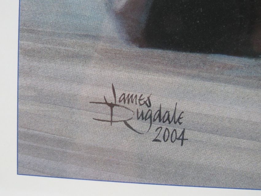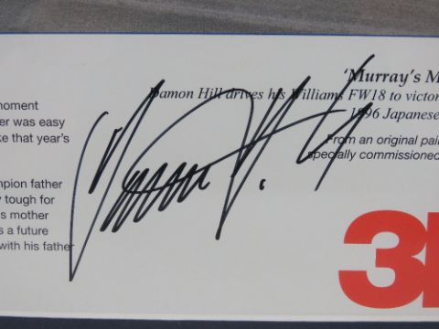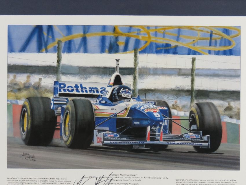 Print 'Murrays Magic Moment' Damon Hill drives his Williams FW18 to victory and the F1 World Championship in the 1996 Japanese Grand Prix Suzuka, from an original painting by James Dugdale 2004, signed lower middle by Damon Hill, 40 x 53cm. Framed and mounted.