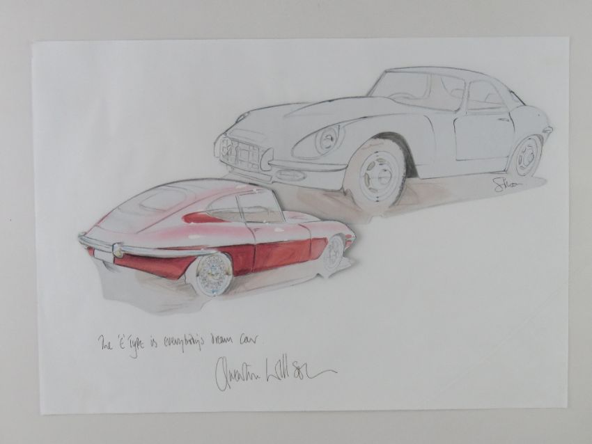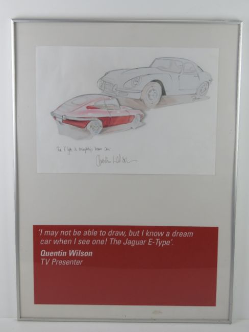 From the famous BEN (Motor and Allied Trades Benevolent Fund) auction at Brooklands Museum on February 17th 2001 where celebrities to create artwork depicting their dream cars. Quentin Wilson (Lot 16 in the BEN auction) 'I may not be able to draw but i know a dream car when i see one - The Jaguar E-Type', 30 x 40cm. Signed by Quentin Wilson, TV presenter. Frames size 72 x 52cm.