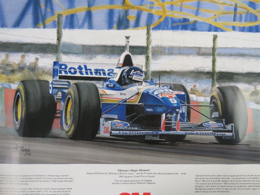 Two coloured prints 'Murrays Magic Moment' Damon Hill drives his Williams FW18 to victory and the F1 World Championship in the 1996 Japanese Grand Prix Suzuka, from an original painting by James Dugdale 2004, 40 x 53cm. Unsigned, previously stored in tube. 42 x 59cm