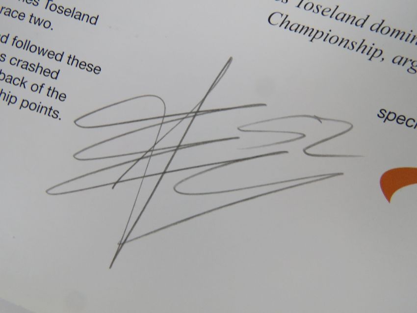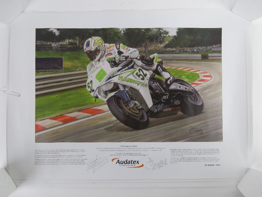Coloured prints 'A Champions Ride' James Toseland at Brands Hatch in the 2007 World Superbike Championship, each signed James Toseland and the artist Jim Dugdale and measuring 42 x 59cm. Ten items, previously stored in tubes.