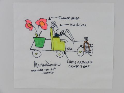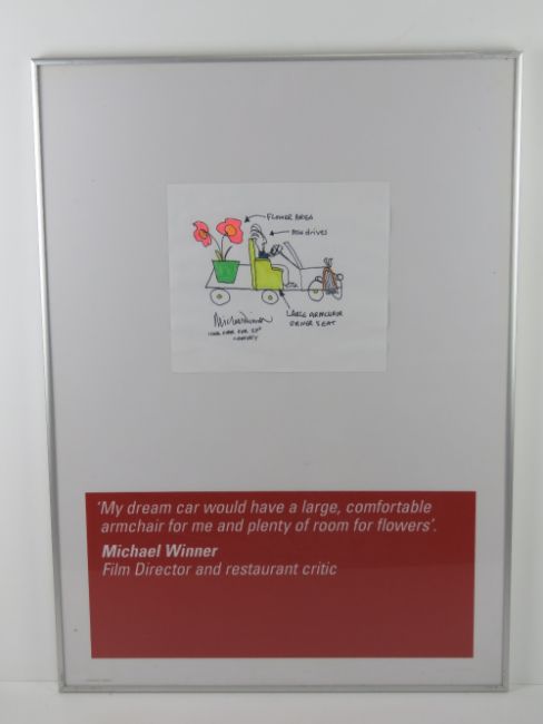 From the famous BEN (Motor and Allied Trades Benevolent Fund) auction at Brooklands Museum on February 17th 2001 where celebrities to create artwork depicting their dream cars. Michael Winner (Lot 27 in the BEN auction) 'My dream car would have a large comfortable chair for me and plenty of room for flowers', 20 x 24cm. Signed by Michael Winner, film director and restaurant critic. Frames size 72 x 52cm.