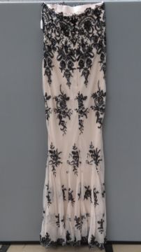 A floor length blush evening dress by Quiz with black sequins, 'as new' with tags, size 10.