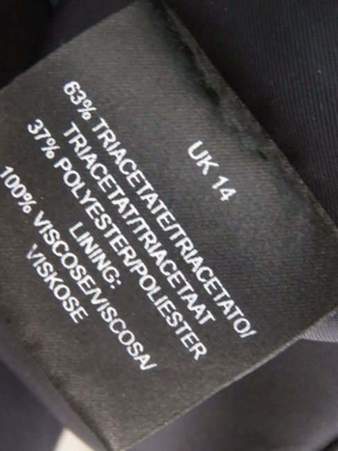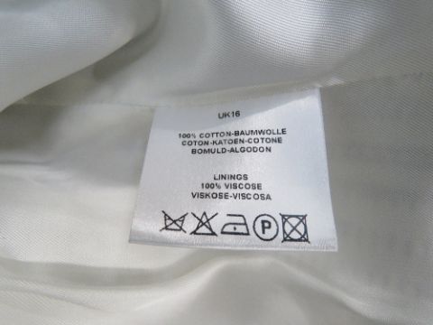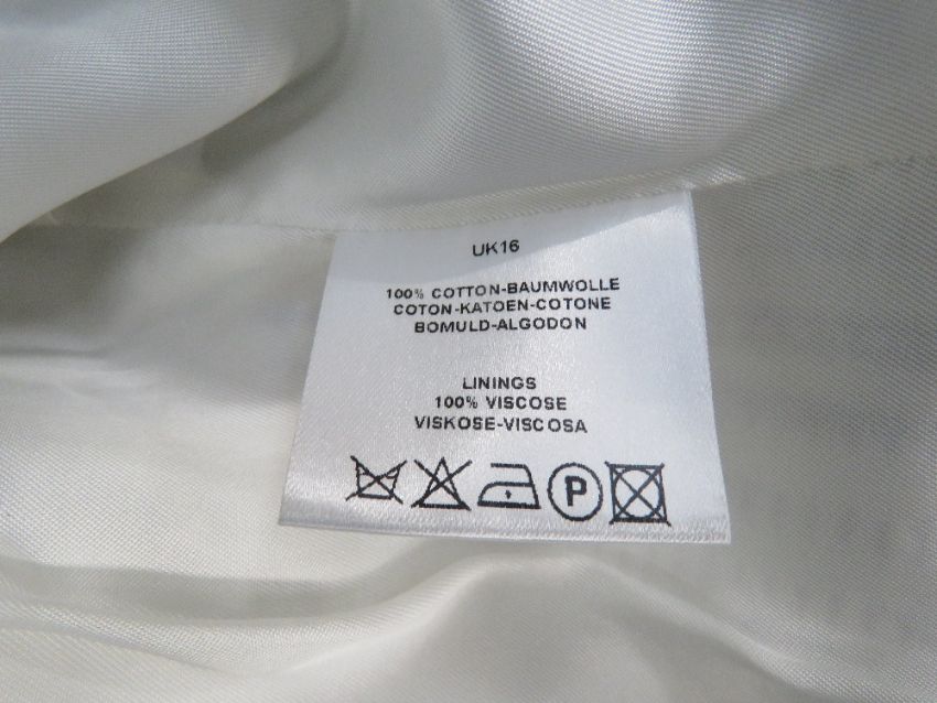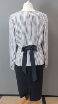 Jaeger; a ladies 100% cotton jacket in navy and white, dry clean only label within, having waist ribbon. Approx measurements; 42" chest, 23 3/4" length at back, 17" sleeve length underarm. Together with a Jaeger navy blue sleeveless shift dress, dry clean only label within, UK size 14, in need of dry cleaning (deodorant stains). Two items.