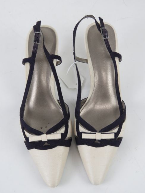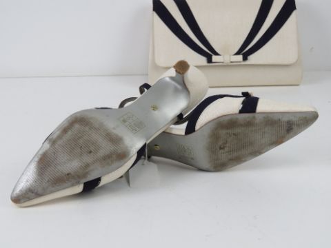 A pair of Jacques Vert purple and cream sling back shoes size 38, in box. Together with matching handbag.