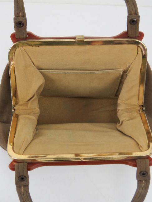 A vintage suede and celluloid handbag, no apparent designer labels, 25 x 15cm.