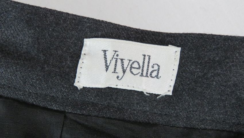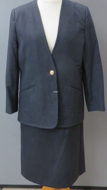 Viyella; 100% pure new wool ladies jacket and skirt, jacket UK size 16, skirt UK size 14, each with dry clean only labels within. One button deficient from jacket. Approx measurements; 44" chest, 28 1/2" length at back, 16" sleeve length underarm. Skirt - 28" length, 31" waist.