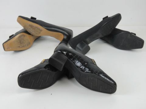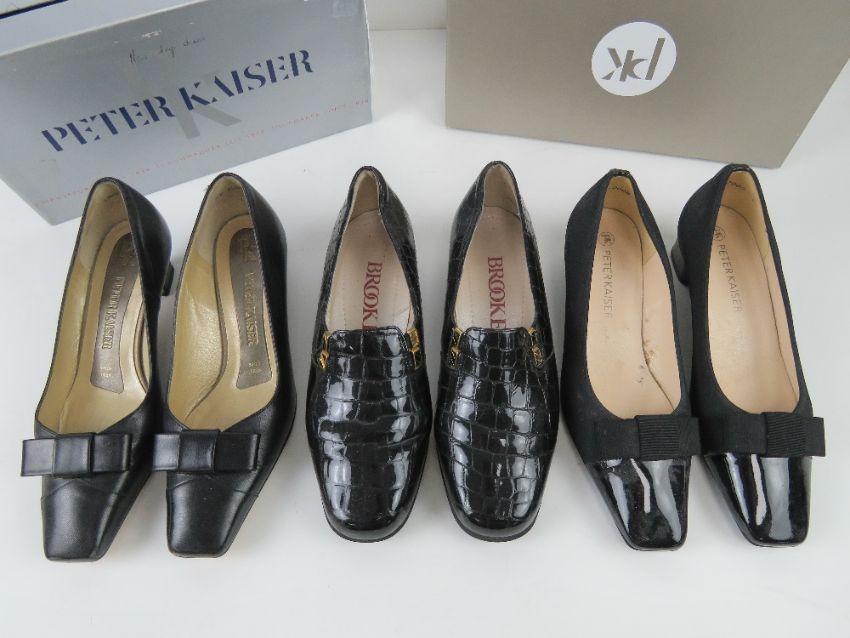 Two pairs of Peter Kaiser ladies leather shoes in boxes, patent toes size 3 and other size 3.5. Together with a pair of black patent leather shoes by Brooke approx size 3.5. Three pairs.