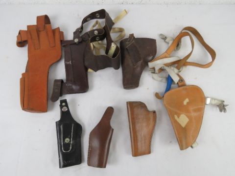 A quantity of seven holsters including a Broomhandle mauser, a colt pythan, s&w, a snub nose revolver holster, magnum, Webley and an 8" revolver holster.