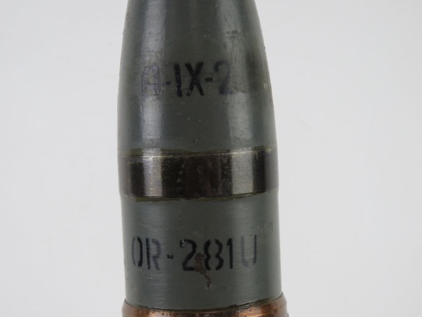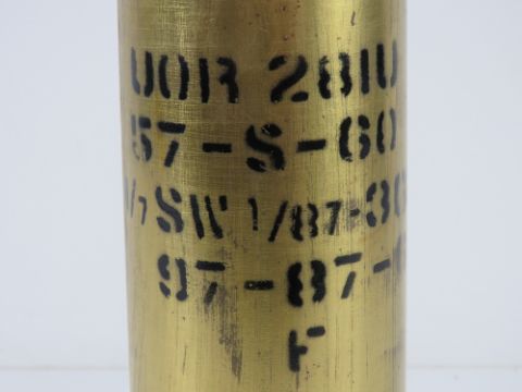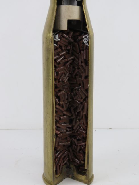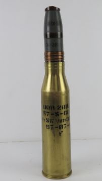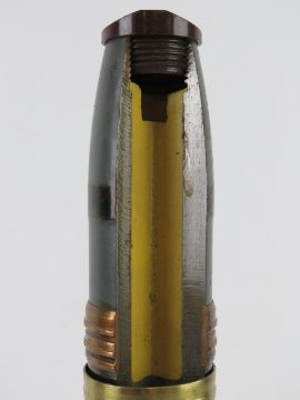 A Russian 57mm anti-aircraft shell cutaway, case and head with stencilling upon.