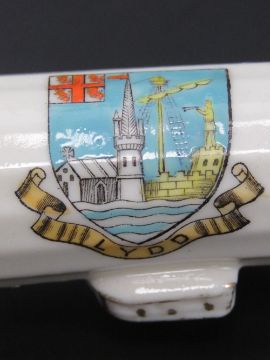 Two items of British WWI crested ware being and aeroplane and a zeppelin.
