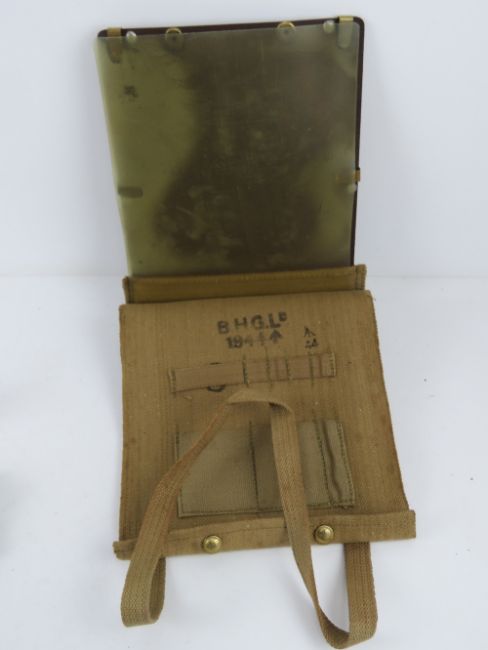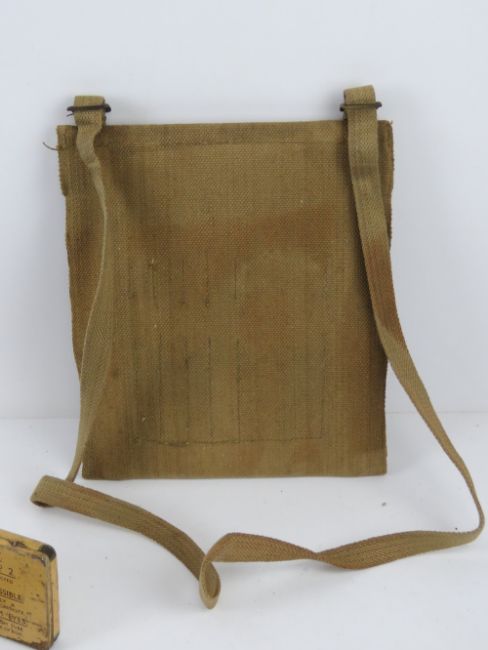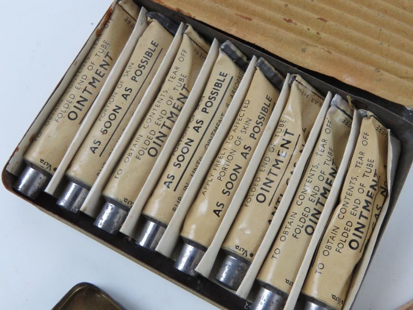 A WWII British map case dated 1944, together with three ointment Anti-gas tins, two having contents within.