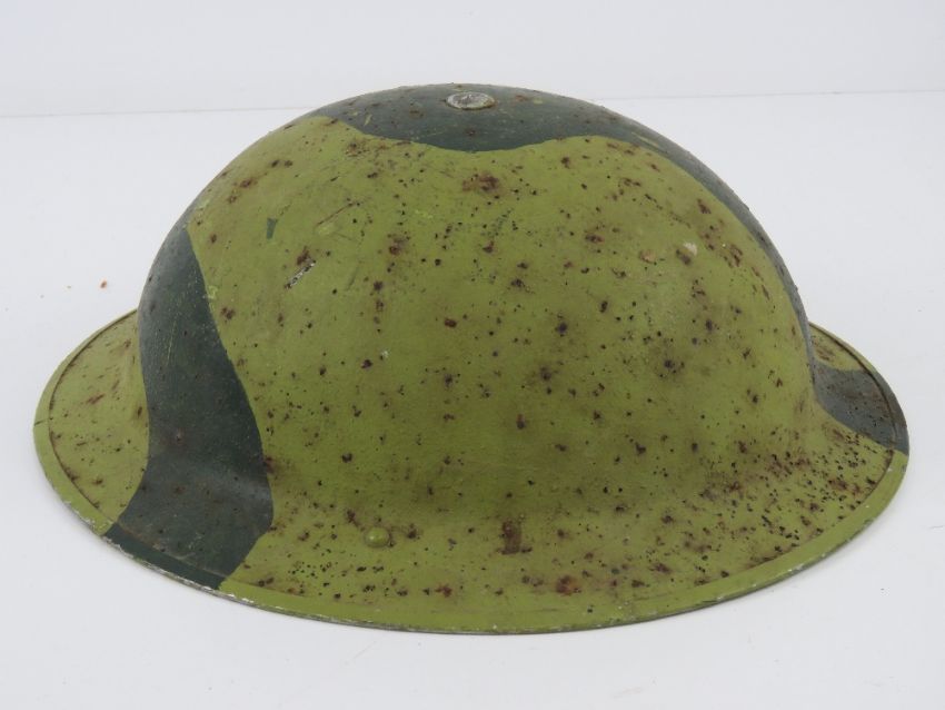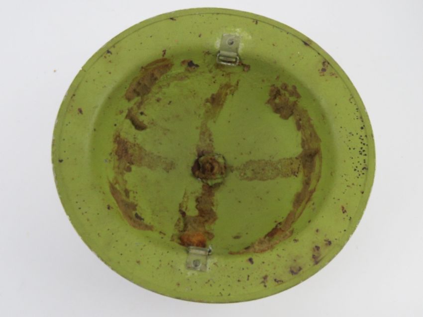 A WWII British helmet, having chin strap hooks either side, strap deficient.