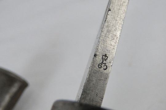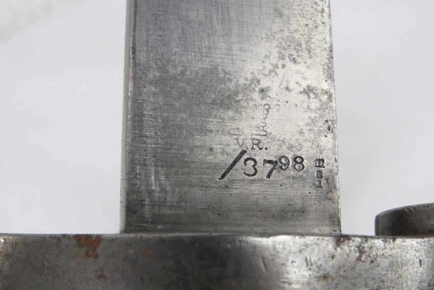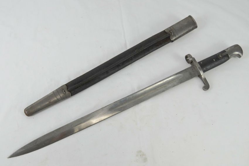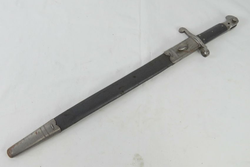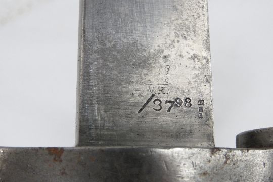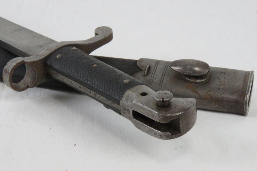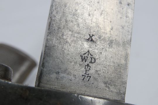 A Martini Henry sword bayonet with scabbard, bearing WD markings and the serial 12065 upon.