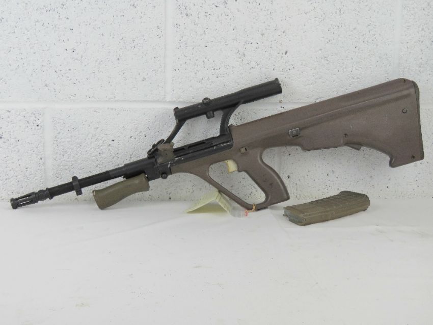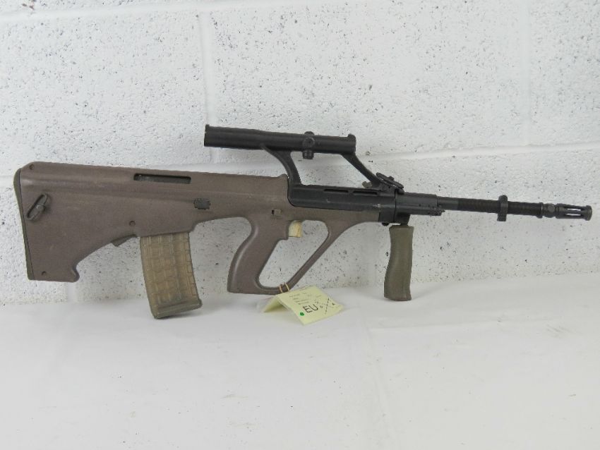 A deactivated Steyr AUG 5.56mm assault rifle having optical sight, moving trigger, safety, cocking handle (under spring pressure), and removable mag. With EU cert.