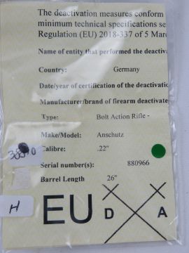 A deactivated Anschutz Model 54 .22LR Match rifle, having moving bolt and trigger. With EU cert.