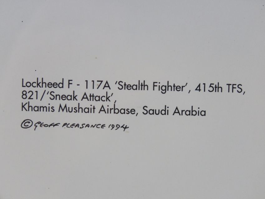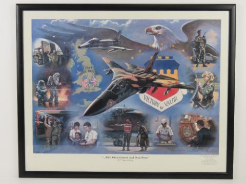 Prints; 'With Glory Gained and Duty Done, 20th Fighter Wing', RAF Upper Heyford, 1970-1993, a reproduction 'from an original painting by Ronald T K Wong, 1993' 59 x 43cm, framed and glazed. Together with a print of the Lockheed F-117A 'Stealth Fighter', 44 x 31cm framed and glazed. Two items.