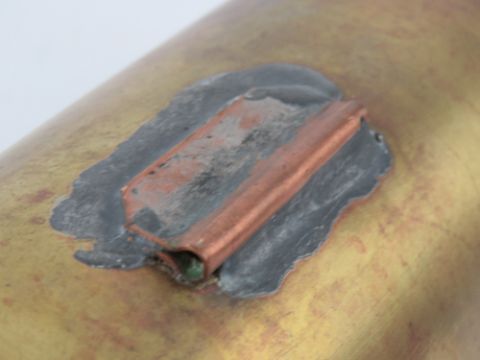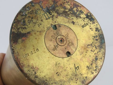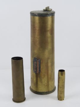 A trench art flask made from a brass shell dated 1917 together with a 30mm brass case and a 20mm shell case. Three items.