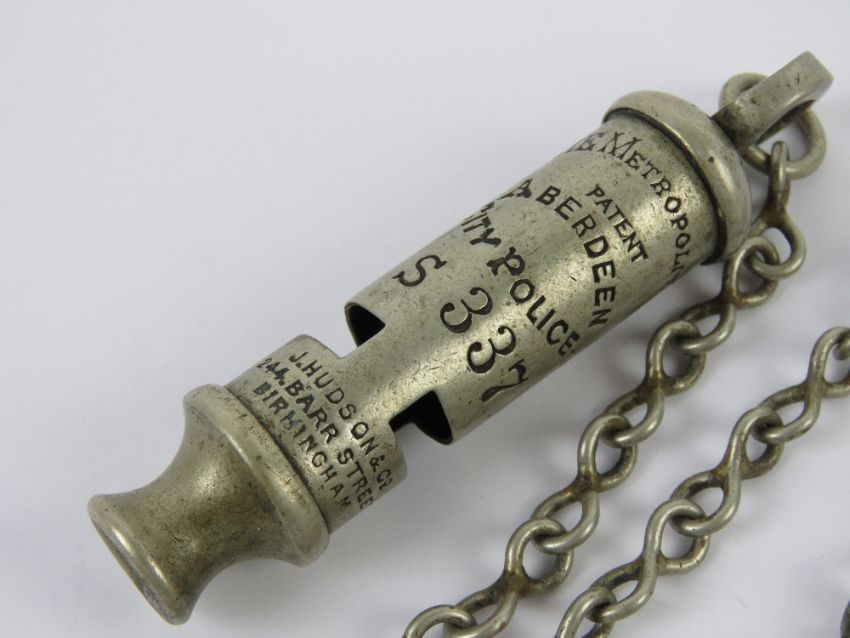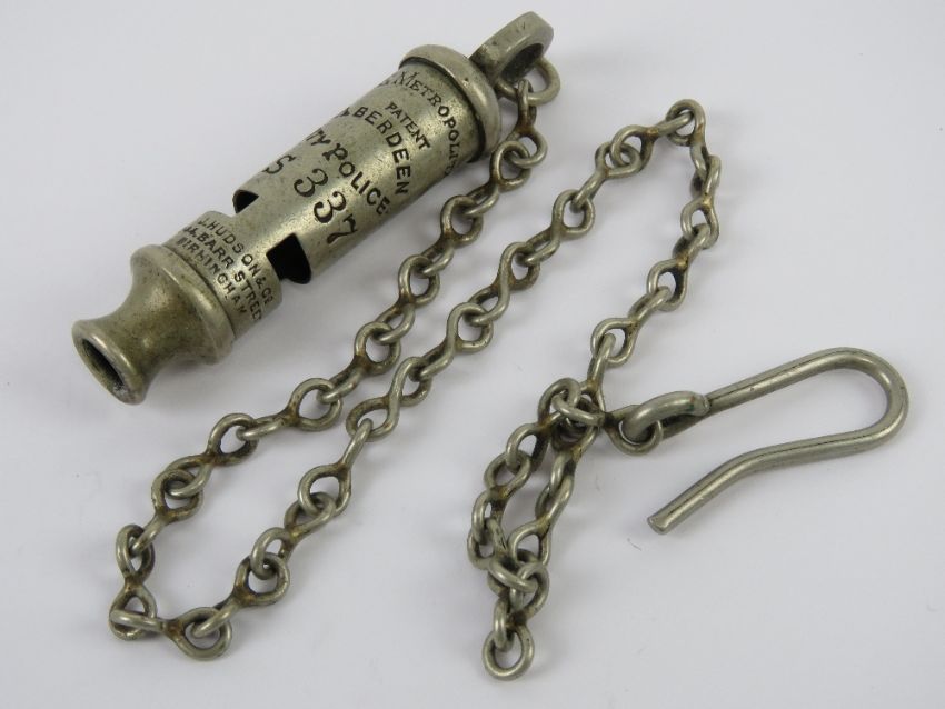 An Aberdeen City Police whistle S337, 'The Metropolitan' patent 5727.08 by J Hudson & Co 244 Barr Street Birmingham.