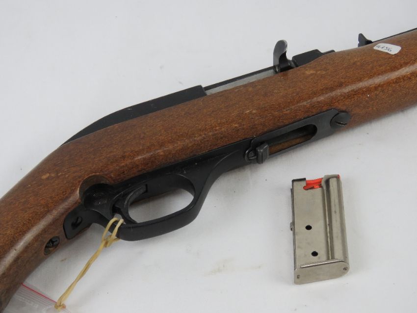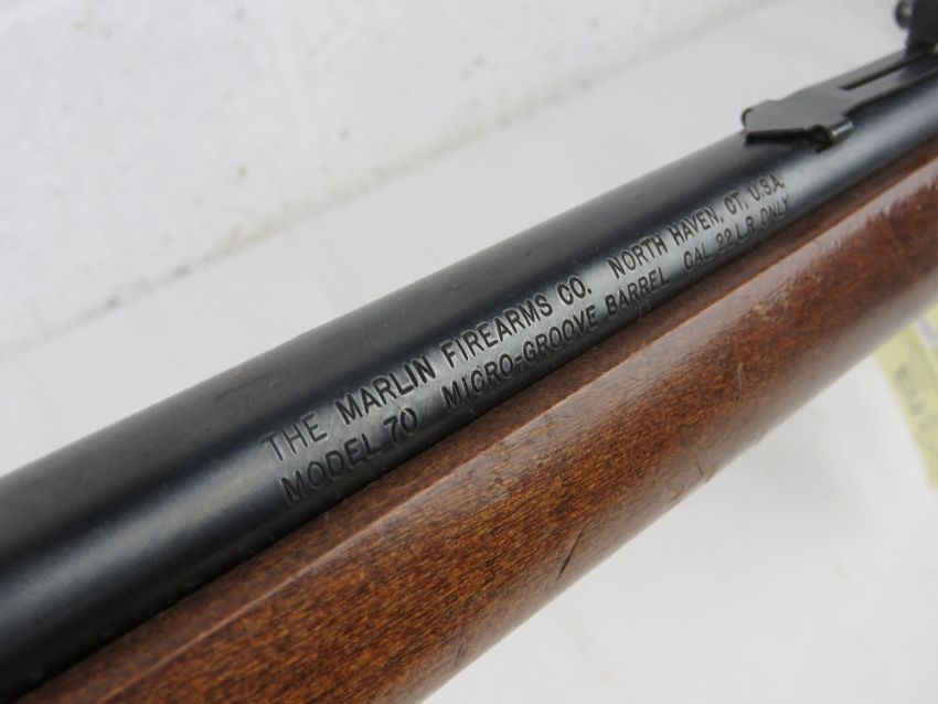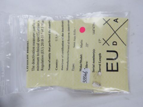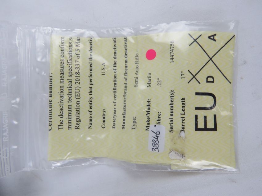 A deactivated Marlin Model 70 .22LR calibre semi auto rifle having threaded muzzle for suppressor, moving trigger and safety, but non firing action. With EU cert.